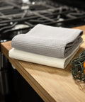 Special waffle weave to meet tough kitchen tasks. Two areas blend for best results: waffle rugged area absorbs water, while smooth-textured stripes polish to perfection.